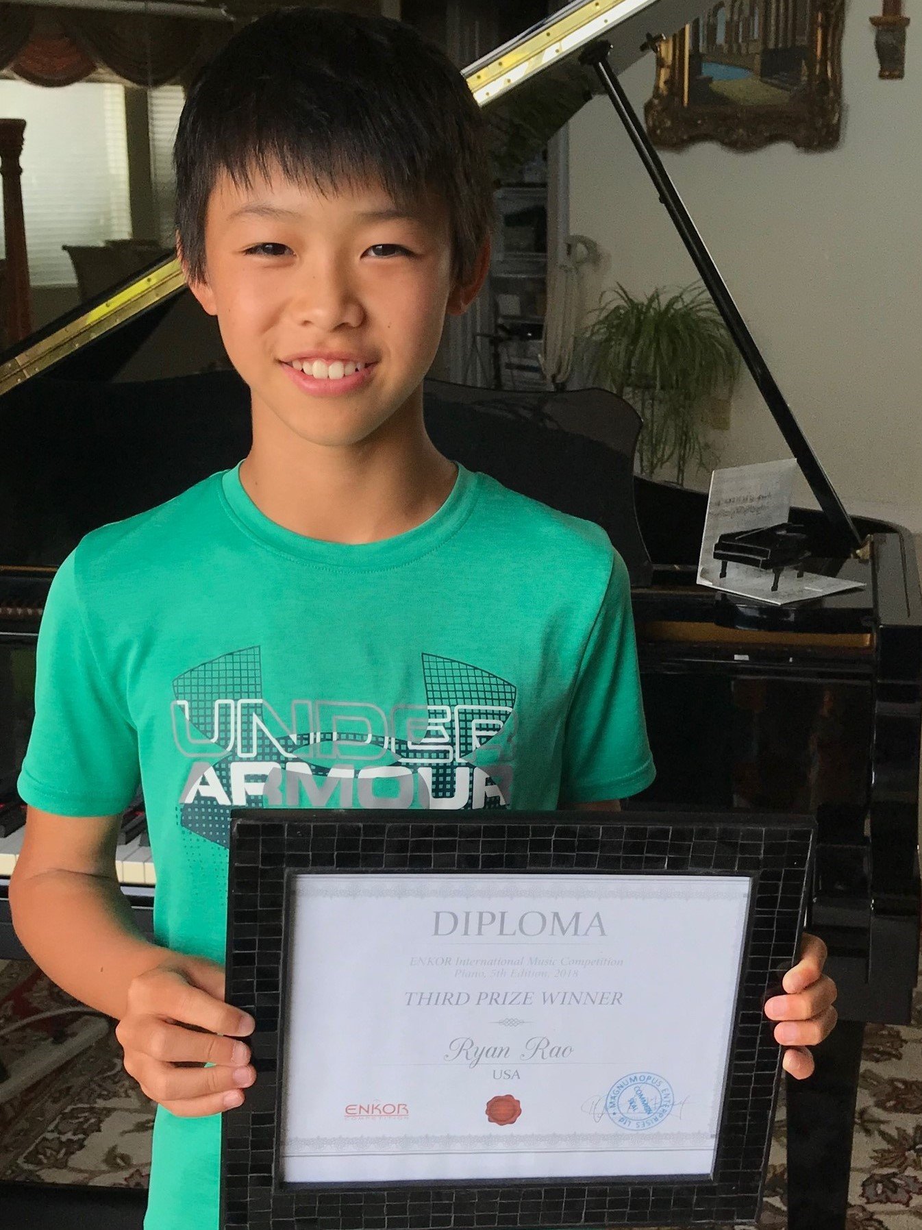 Congratulations to my 11 years old student Ryan Rao! He is one of the Winners of the International Enkor Piano Competition. He participated in the 11-15 y.o. category and had to compete with the 15 y.o. students. Students had to perform compositions from all periods of the music history.